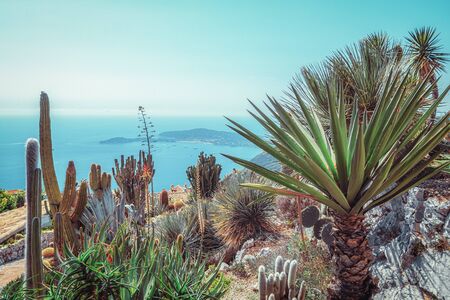 The beautiful botanical garden with exotic plants like cacti and yuccas in the village of Eze in France
