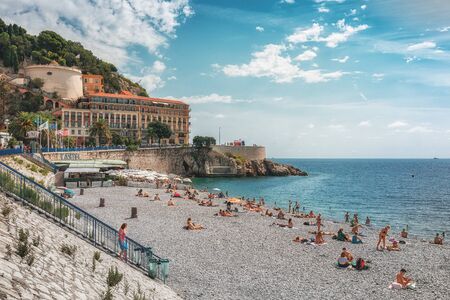 NICE, FRANCE - JUNE 26, 2017: People enjoying sunny weather on the beach of Mediterranean sea