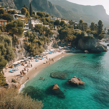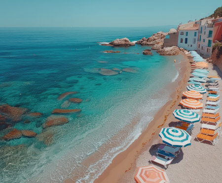 Brightly colored umbrellas are arranged on a sandy beach against the backdrop of clear turquoise water and rocky outcrops. A picturesque and inviting seaside scene.