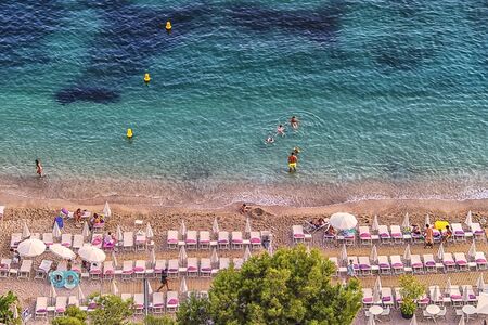 Yalta, Crimea - 09/07/2019: People relaxing, sunbathing and swimming on a public beach.