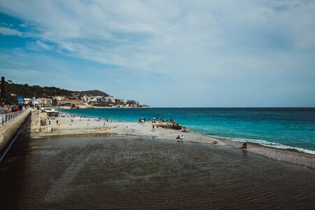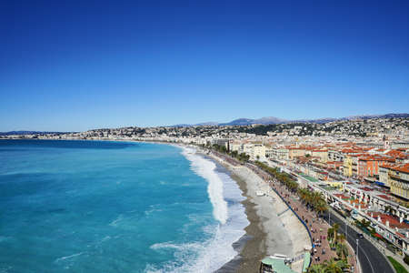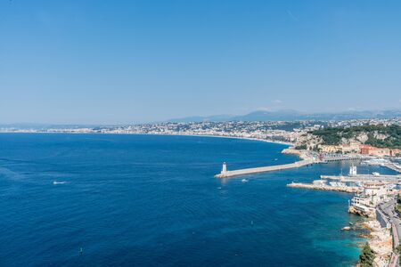 Panoramic view of Nice coastline and beach with blue sky, France. Summer