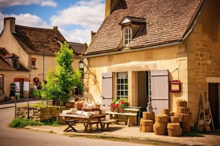 a small village bakery with a rustic sign, created with generative ai