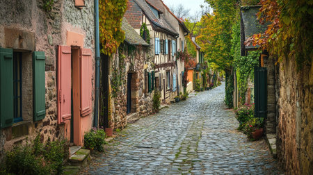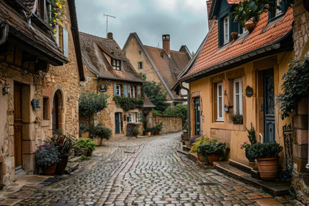 Cobblestone street in a quaint European village with historical buildings and rustic charm, A charming European village with cobblestone streets and historic architecture