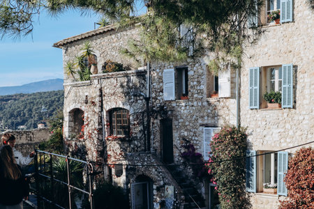 Stone exterior of old buildings with flowers on the streets of Eze Village, picturesque medieval city in South of France along the Mediterranean Sea