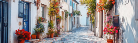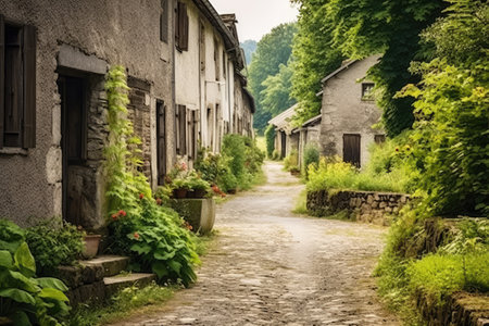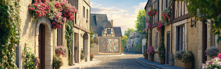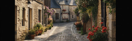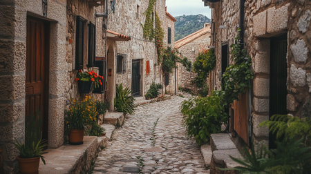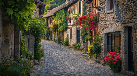 A serene cobblestone street in a quaint village adorned with vibrant flowers and rustic stone houses, evoking a sense of tranquility and charm.