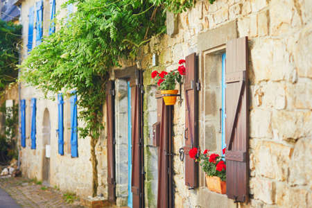 Facade of old stone buildings in Perouges, red windows, flowers, France. High quality photo