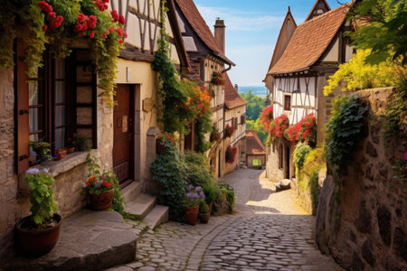 A picturesque cobblestone street in a charming village is adorned with vibrant blooming flowers, creating a serene atmosphere under clear blue skies.