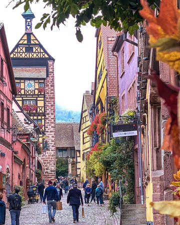 Old street in Riquewihr, Alsace, France, A charming, cobblestoned European village with bright, quaint houses, AI Generated