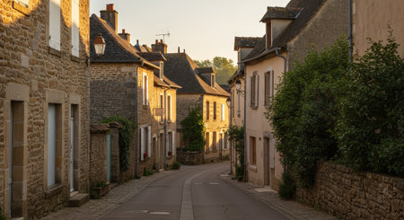 A tranquil, narrow street winds through a traditional French village at sunset, lined with old stone houses featuring shuttered windows and warm facades.