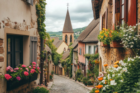European village with cobblestone streets, flower-filled window boxes, and a historic church steeple rising above the rooftops. Generative AI