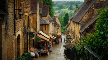This picturesque town showcases narrow streets lined with medieval stone buildings, lively market stalls filled with local goods, and surrounding lush countryside, encapsulating historic charm.