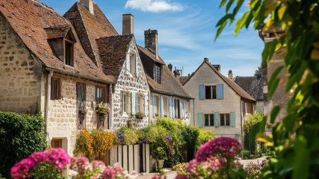 A picturesque village street lined with charming houses and blooming flowers in spring, capturing a serene rural atmosphere perfect for travel or relaxation.