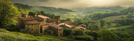 The medieval village of Taramundi showcases its charming stone houses nestled among verdant forests and hills, illuminated by soft afternoon light, highlighting Asturias' natural beauty.