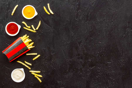Chips fries and ketchup on a dark background. Top view, Unhealthy food