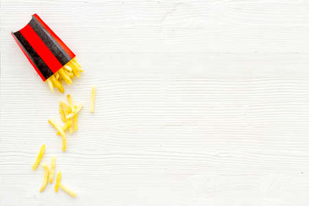 Potatoes French Fries in Red and white Carton Package Box. Fast Food