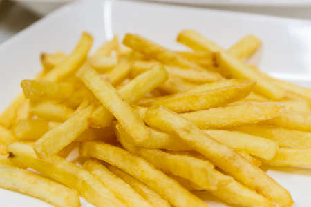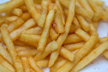Golden French fries potatoes on white background. Selective focus. Shallow depth of field.