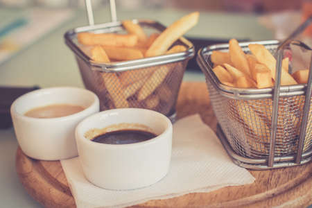 French fries with sauces served on round wooden board. Toned image
