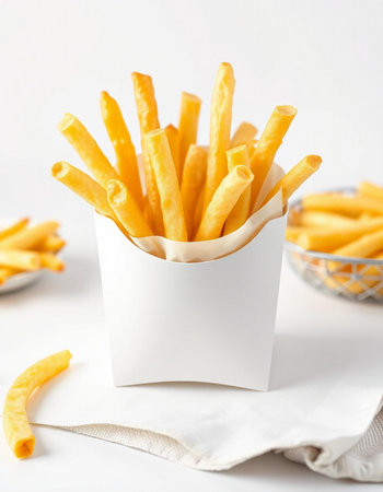 French fries in a white box on a white background, fast food
