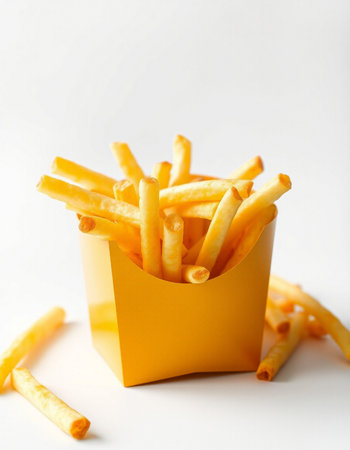 Golden French fries in a yellow paper box on a white background.