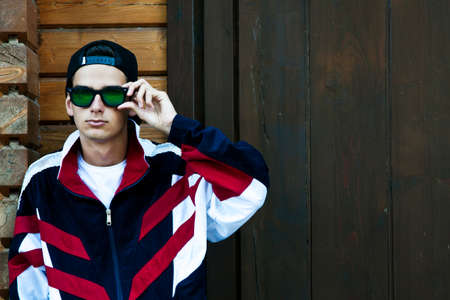 Panoramic banner, portrait of young confident hipster guy wearing denim jacket, round glasses and cap, isolated on background of lush lava color with copy space.
