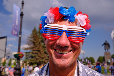 St. Petersburg, Russia - July 14, 2018: Football fans before the match of Belgium and England for third place on a fine sunny day. Joy, fun.