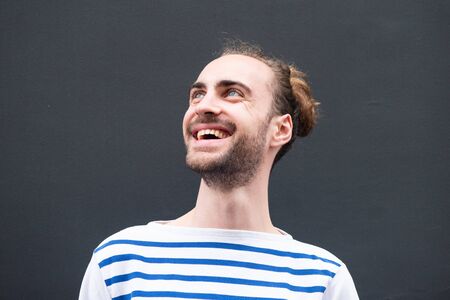 side portrait of young man with long hair in ponytail smiling and looking up by white background