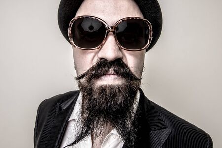 Bearded Man with black Suit, Sunglasses and Bowler Hat