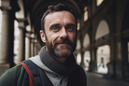 Bearded man in gray beret with scarf. Studio portrait on a light background.