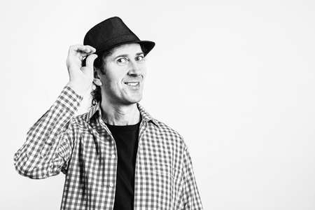 Happy man wears retro hat. Nerd smiling and looking to camera. Male fashion, lifestyle. Copy space.