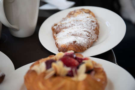 Closeup of bakery products in the restaurant, Russia, Moscow. Food background.