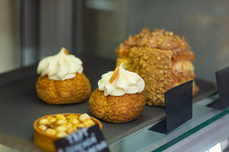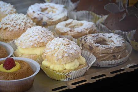 Close-up of fresh and beautiful french pastries in a bakery showcase