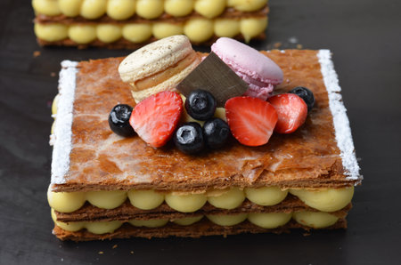 Traditional French dessert millefeuille with vanilla cream and fresh berries on Baking Tray Background