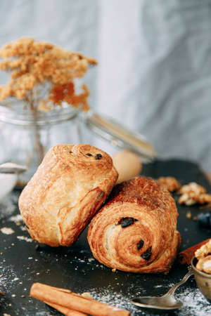 Sweet dessert with chocolate chips on a wooden background. Puff pastry pie with chocolate wrapped in a roll.