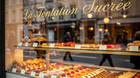 A tempting display of French pastries, including eclairs, fruit tarts, croissants, and macarons, arranged on a marble counter in a Parisian bakery, showcasing culinary artistry.