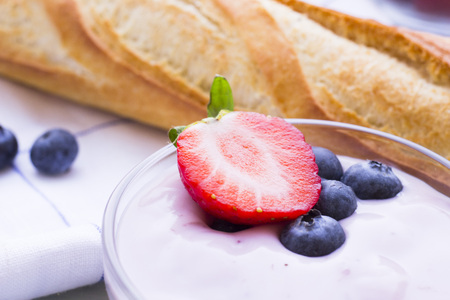 Romantic French or Rural Breakfast with a baguette, homemade youghurt and fresh blueberries and strawberry. Napkin and wood as a background, close up
