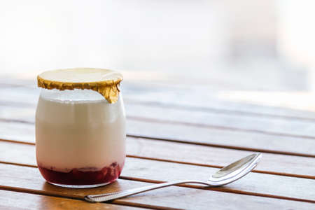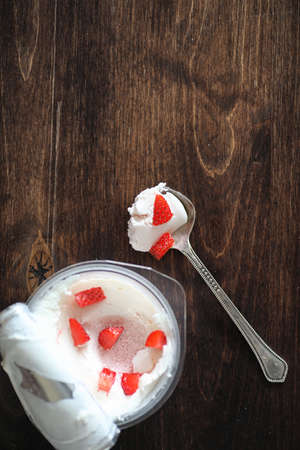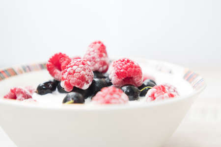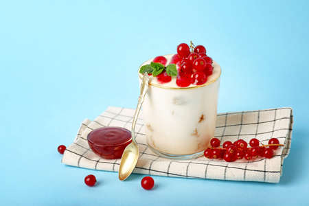 Food and drink, still life concept. Home made yogurt with frozen red currant berries on a wooden table. Selective focus