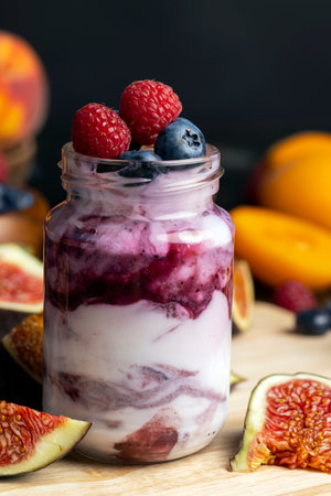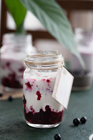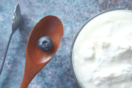 Fresh delicious yogurt made from milk with blueberry flavor, yogurt with fresh berries and blueberry jam