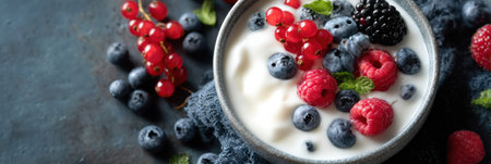 yogurt and blueberries. Healthy breakfast. Super food healthy eating vegetarian vegan food. Long banner format.