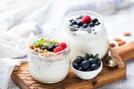 Two glass jars with fresh homemade organic yogurt decorated with fresh berries and mint, white marble background copy space
