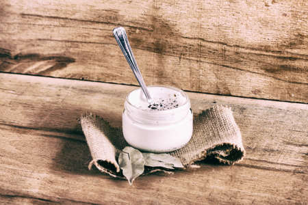 Retro photo. Sour cream sauce on sack cloth on wood desk. Food background