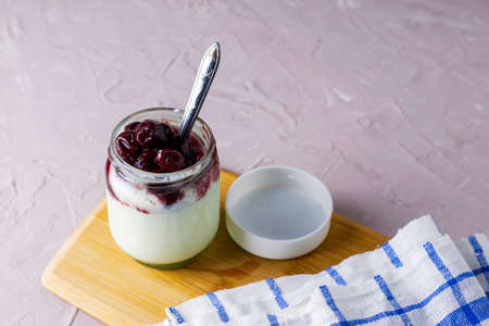 a jar of yogurt with cherry jam on a cutting board next to a towel. High quality photo