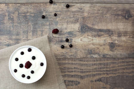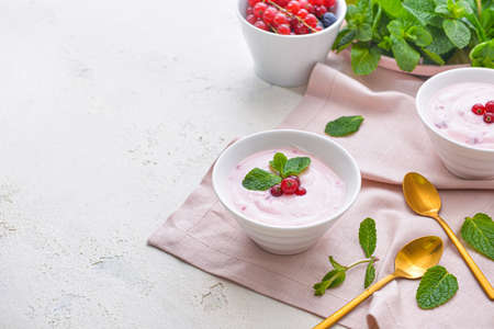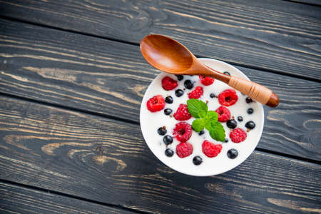 Yogurt with fresh berries in a bowl on a table. Healthy breakfast, dessert or snack