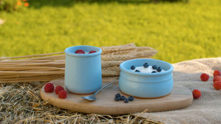 Close up shot of yogurt with raspberries and blueberries and sheaf of ripe wheat ears on a wooden cutting board in the garden at summer day.