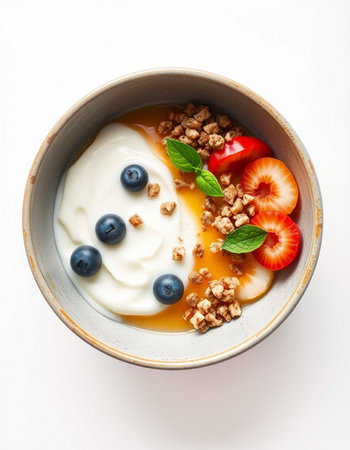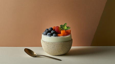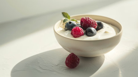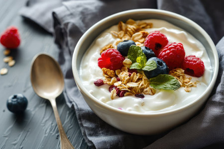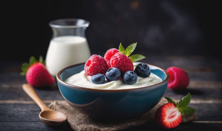 A tasty bowl of organic yogurt topped with fresh berries and mint, perfect for a nutritious breakfast or snack in a cozy kitchen.