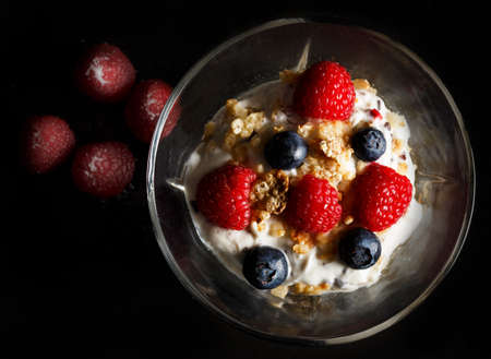 Yogurt bowl with oat flakes, blueberries and raspberries on black background. Healthy breakfast concept. Dark moody style.Top view. Horizontal image.