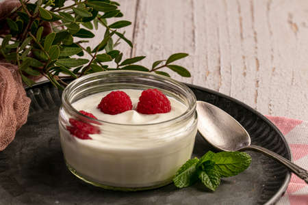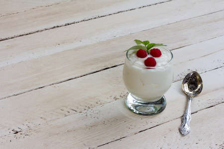 fresh yogurt with raspberry and green mint on wooden table. sweet dessert food