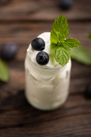 Blueberry yogurt in a jar on wooden table background. Healthy food rich in protein and calcium, weight loss product