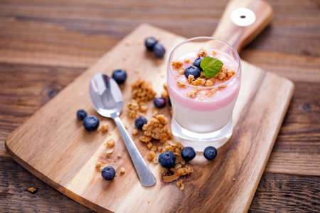 A glass of yogurt with blueberries and strawberries, granola and nuts on a wooden table, healthy breakfast