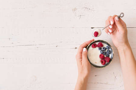Top view on girl hands with a bowl of yogurt. Young woman eating organic yogurt with fresh berries on vintage wooden table background. Healthy yogurt with raspberries and blueberries for breakfast.