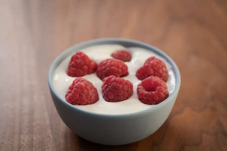 Yogurt with fresh raspberries in blue ceramic bowl on walnut table